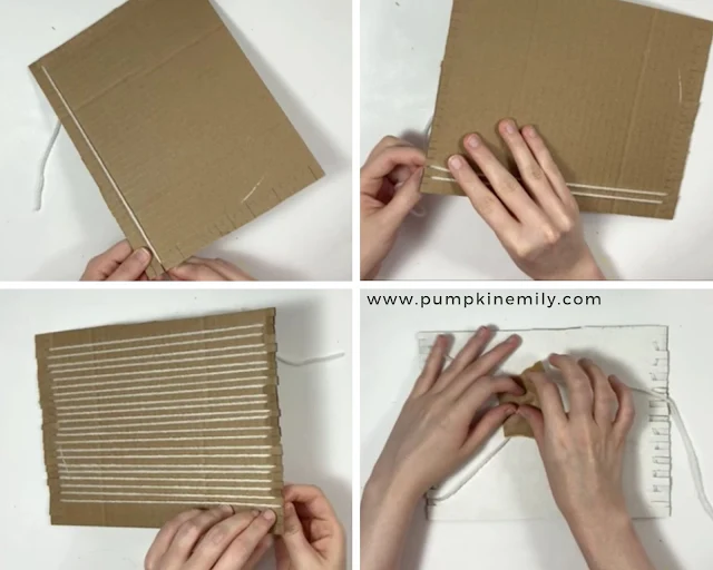 16. Push the yarn down next to the large piece of cardboard that's woven on the yarn.